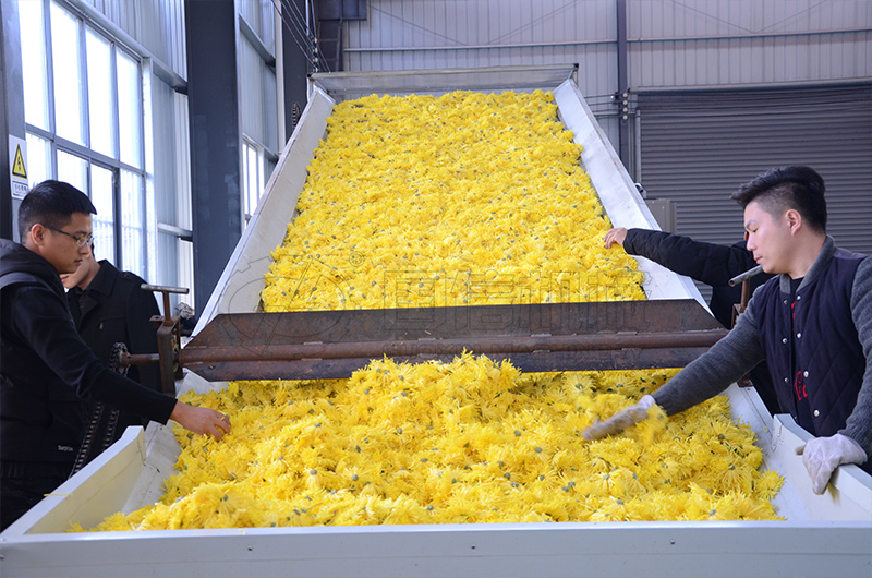 菊花烘干前,要先進行機械殺青。機械殺青包括蒸汽殺青和微波殺青兩種方式。