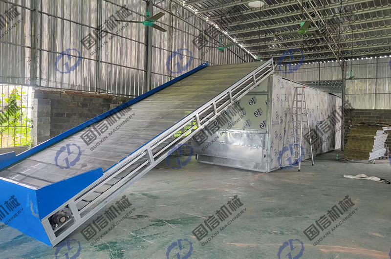 這臺全自動網(wǎng)帶式烘干機(jī),采用的是多層循環(huán)翻轉(zhuǎn)結(jié)構(gòu),經(jīng)清洗加工后的中藥材會經(jīng)過上料輸送機(jī)均勻地送入烘干主機(jī)內(nèi)部,會在內(nèi)部多層不銹鋼網(wǎng)帶的傳送下,循環(huán)翻轉(zhuǎn),與此同時,熱源提供的熱量,會在引風(fēng)機(jī)的作用下,以熱風(fēng)的形式進(jìn)入烘干主機(jī)底部,熱風(fēng)會自下而上的逐層穿過不銹鋼網(wǎng)帶物料層,帶走其中的水分,從烘干主機(jī)頂部排出,達(dá)到中藥材干燥效果。