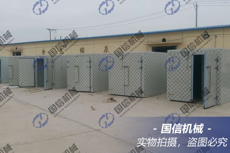 中型黃花菜烘干房的日處理鮮黃花菜片為800公斤到2噸,一共有144個標準托盤,托盤尺寸為600毫米寬、800毫米長,144個托盤分別放置在6個小推車上,推車的層間距經過合理設計,保證熱風可以均勻穿透。