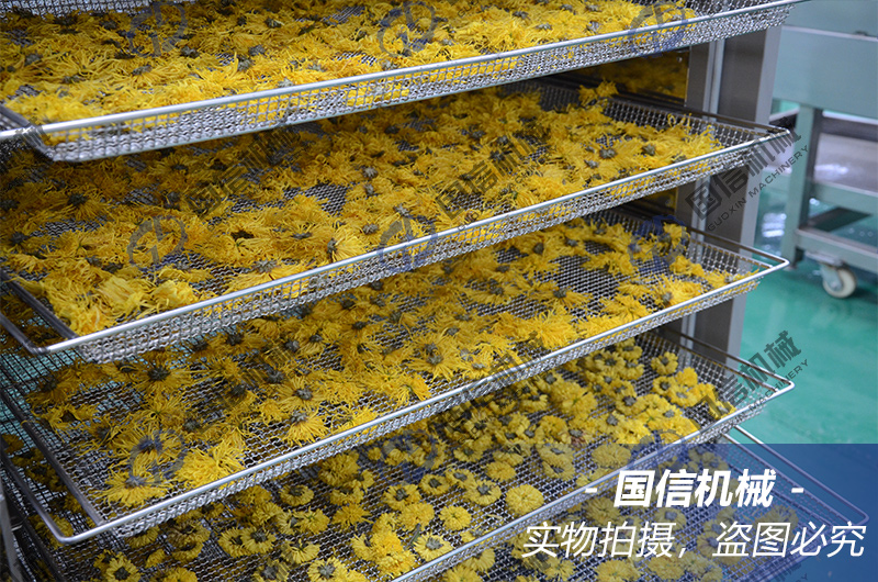 (部分菊花需要殺青階段:設置溫度65℃~70℃,時長2~3小時,如果需要,可以在進料前在鮮菊花上噴灑少量清水,殺青效果更好。)