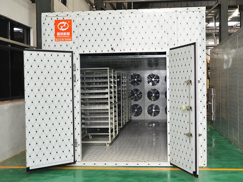 國信空氣能熱泵烘干房由物料托盤、空氣管道、熱泵烘干除濕機、多套耐高溫軸流風機、帶輪子的手推車支架、10cm具有高保溫性能的聚氨酯板組成。
